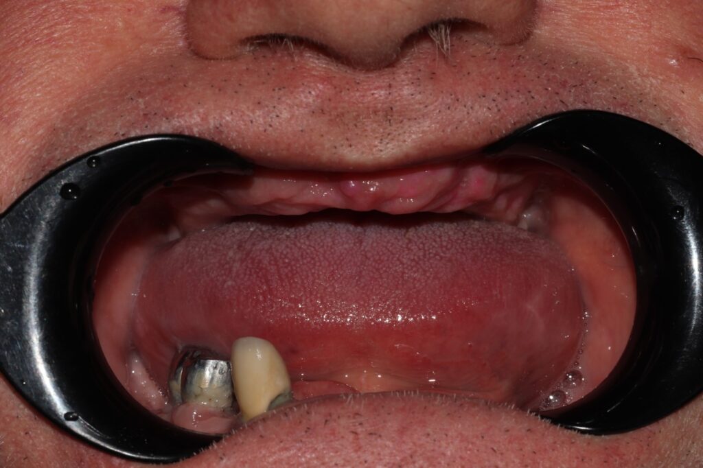 Жалоба: Пациент обратился с полной потерей зубов на верхней челюсти и практически полной — на нижней. Из-за этого были нарушены жевательная функция, речь и эстетика лица. Состояние доставляло значительный физический и психологический дискомфорт.