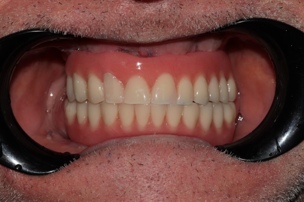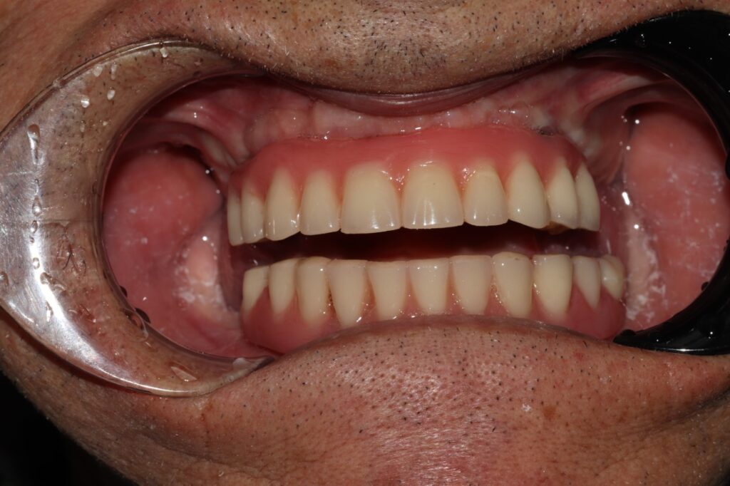 Лечение: На первом этапе проведена комплексная диагностика и хирургическое вмешательство — тотальная реабилитация обеих челюстей с установкой по 4 импланта (на верхней и нижней челюсти). Использована методика немедленной нагрузки с фиксацией временных адаптационных протезов. Это позволило пациенту быстро вернуться к полноценной жизни без длительного периода без зубов.