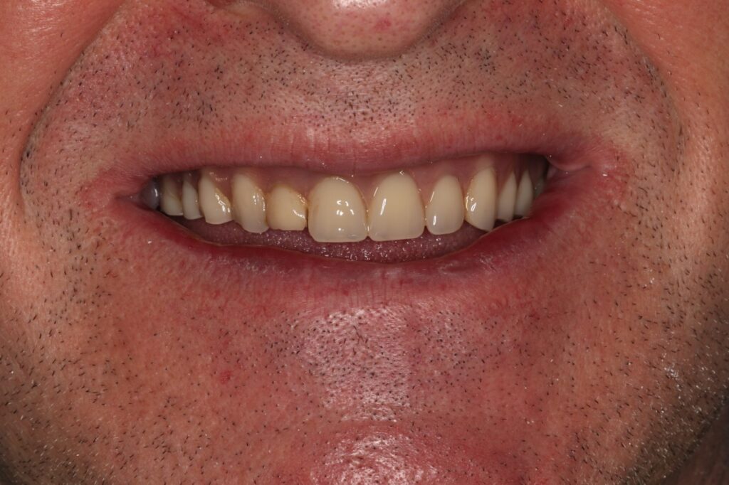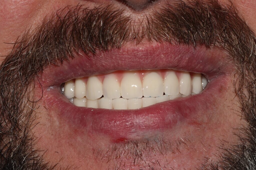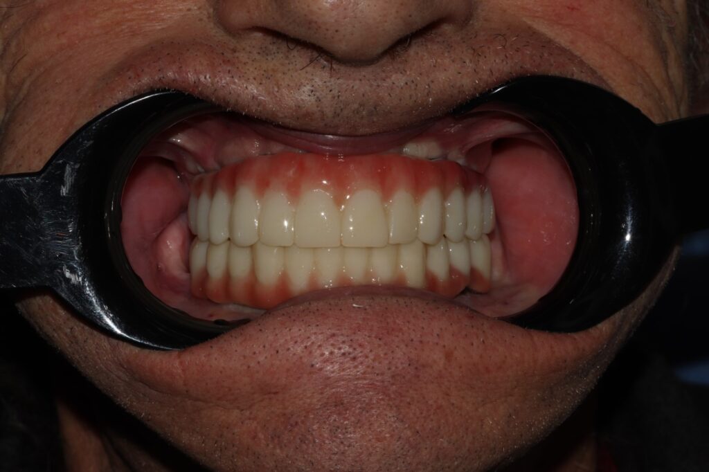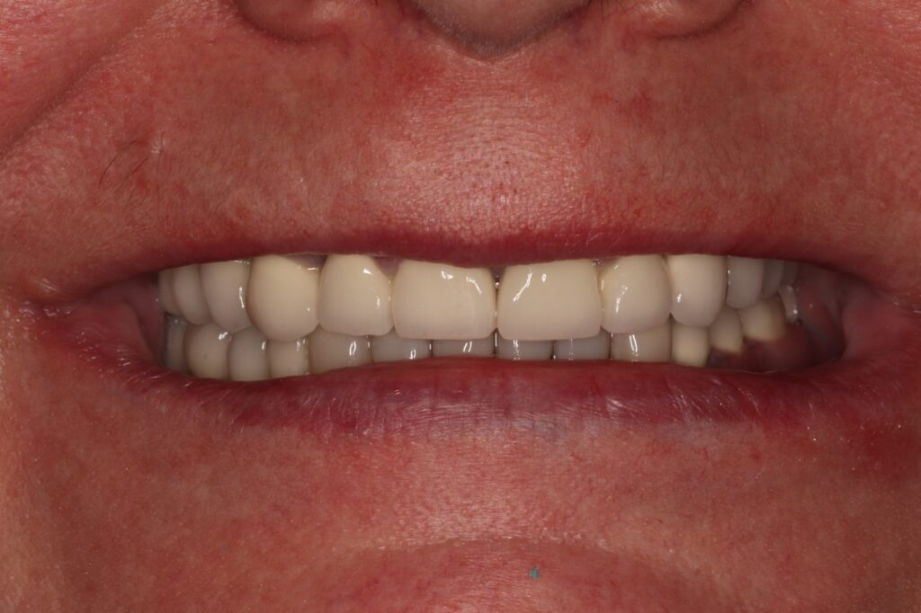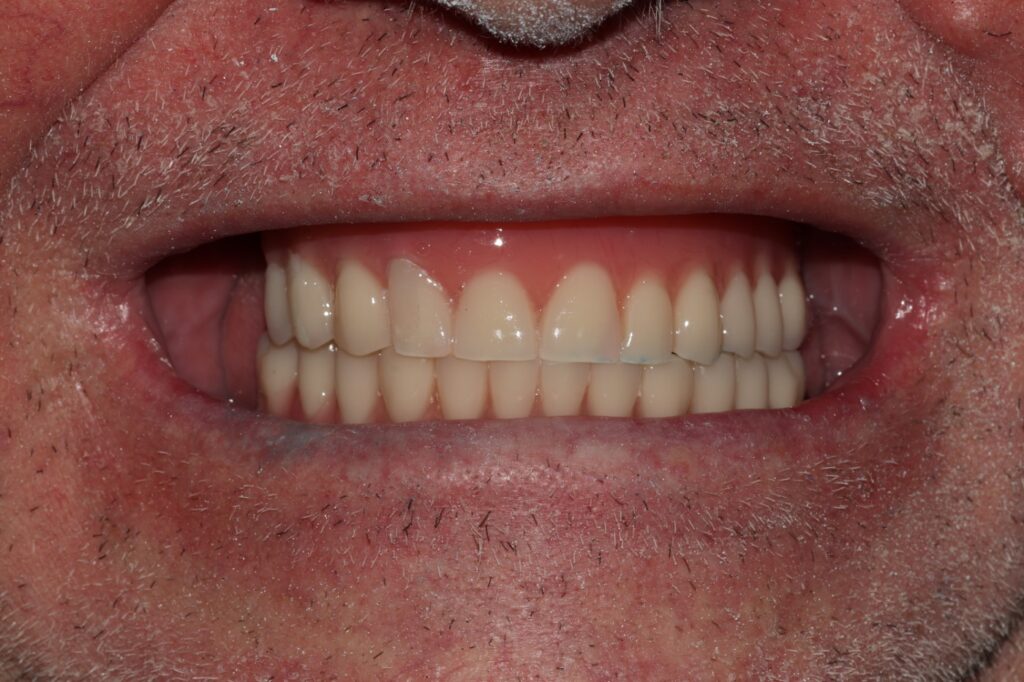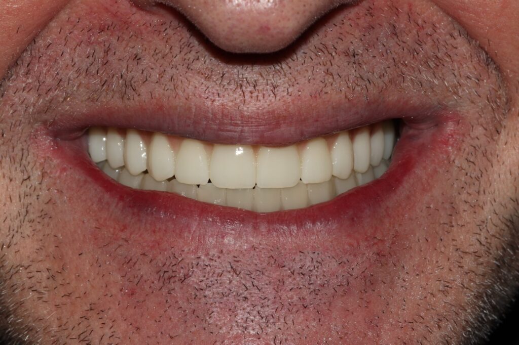 После успешной остеоинтеграции имплантов, пациент вернулся для завершения лечения. На временных протезах он уже восстановил основные функции, но был готов к эстетически совершенной и долговечной конструкции.
