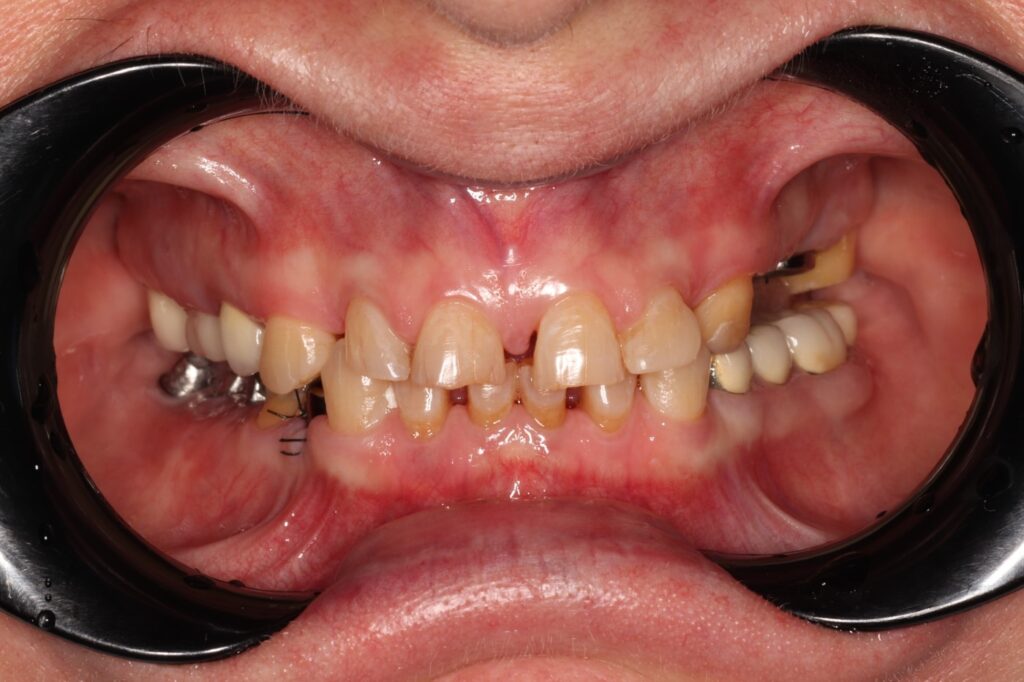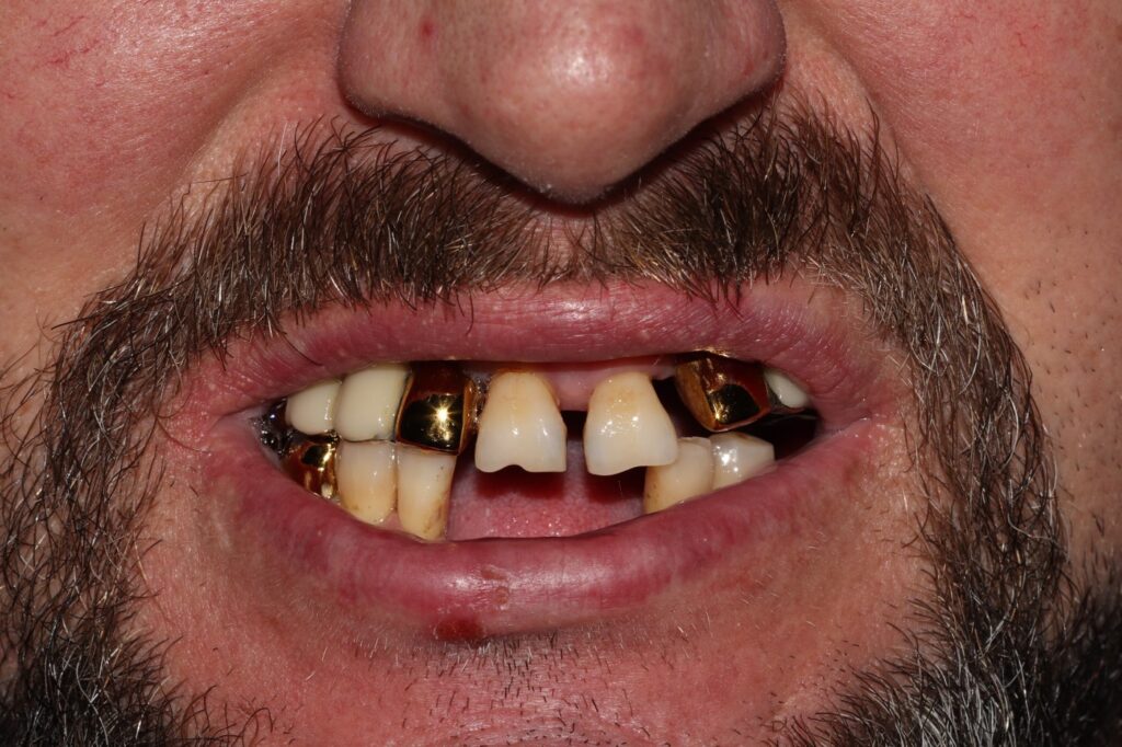 Жалоба: Пациент обратился с выраженным разрушением зубов, отсутствием ряда жевательных единиц и нарушением прикуса. Эстетика улыбки и функция были значительно снижены, что вызывало дискомфорт в повседневной жизни и неуверенность при общении.